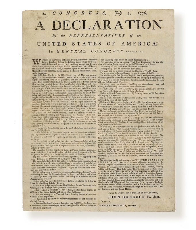 Revolution traces the war from the battles of Lexington and Concord in 1775 to victory at Yorktown in 1781 and the aftermath. A rare July 1776 broadside of the Declaration of Independence, adopted more than a year after fighting began, is on display near a June 1776 Philadelphia printing of the Virginia Declaration of Rights, one of the inspirations for the U.S. Declaration.