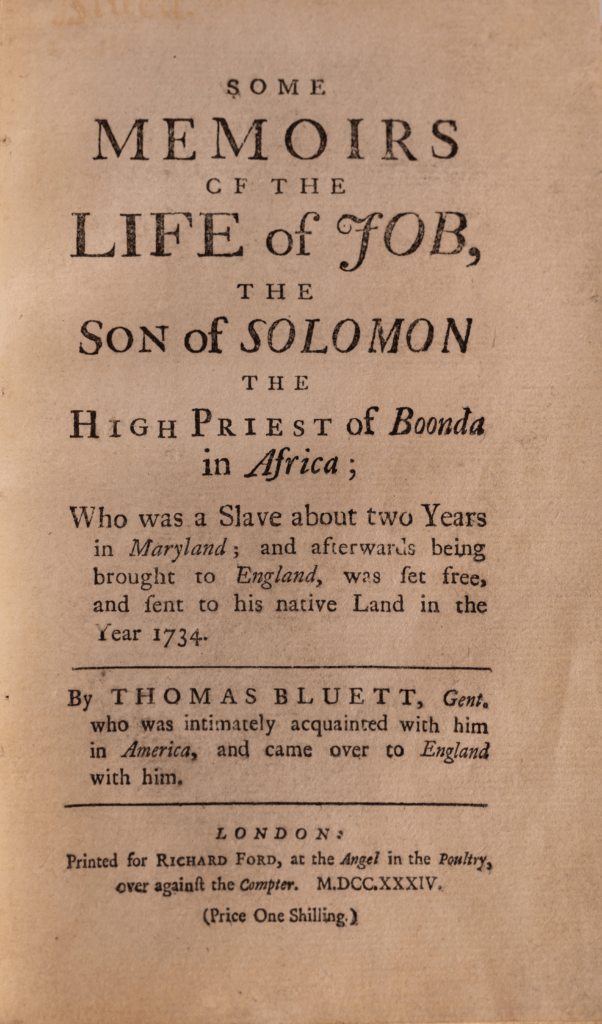 - ● Thomas Bluett, Some Memoirs of the Life of Job, The Son of Solomon The High Priest of Boonda in Africa Who Was a Slave about two Years in Maryland; and Afterwards Being Brought to England, Was Set Free and Send to his Native Land in the Year 1734, https://docsouth.unc.edu/neh/bluett/bluett.html.
